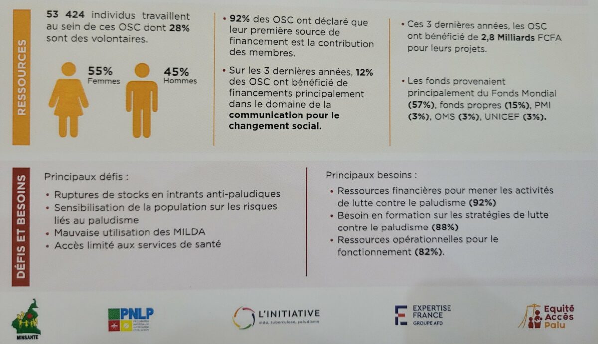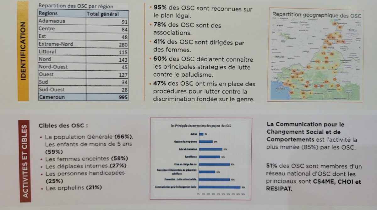 Le rôle des OSC est en effet non négligeable, dans la lutte contre le paludisme car pour la plupart elles sont au plus près des populations et des communautés. Au total, 995 OSC ont été cartographiées sur l’ensemble du territoire camerounais dont 95% sont reconnues sur le plan légal et 78% sont des associations.